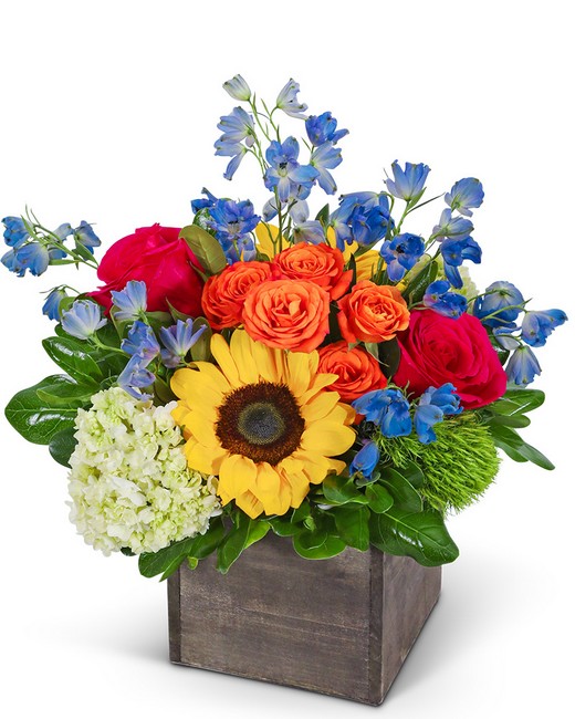 Experience the vibrance of our Sunrise in Havana flower design, an explosion of bright, bold colors that will infuse any space with energy and joy. This exuberant arrangement showcases a kaleidoscope of hues from the rainbow, featuring a mix of sunflowers, roses, hydrangeas, delphiniums, green trick dianthus, and lush foliage. Perfect for birthdays, anniversaries, or any occasion that calls for a burst of joy, the Sunrise in Havana flower design is a show-stopping gift that will leave a lasting impression.